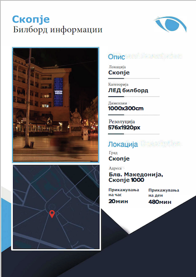 Стратешки поставени LED екрани: локации со голем сообраќај, централни улици, прометни крстосници и трговски зони за максимална изложеност.